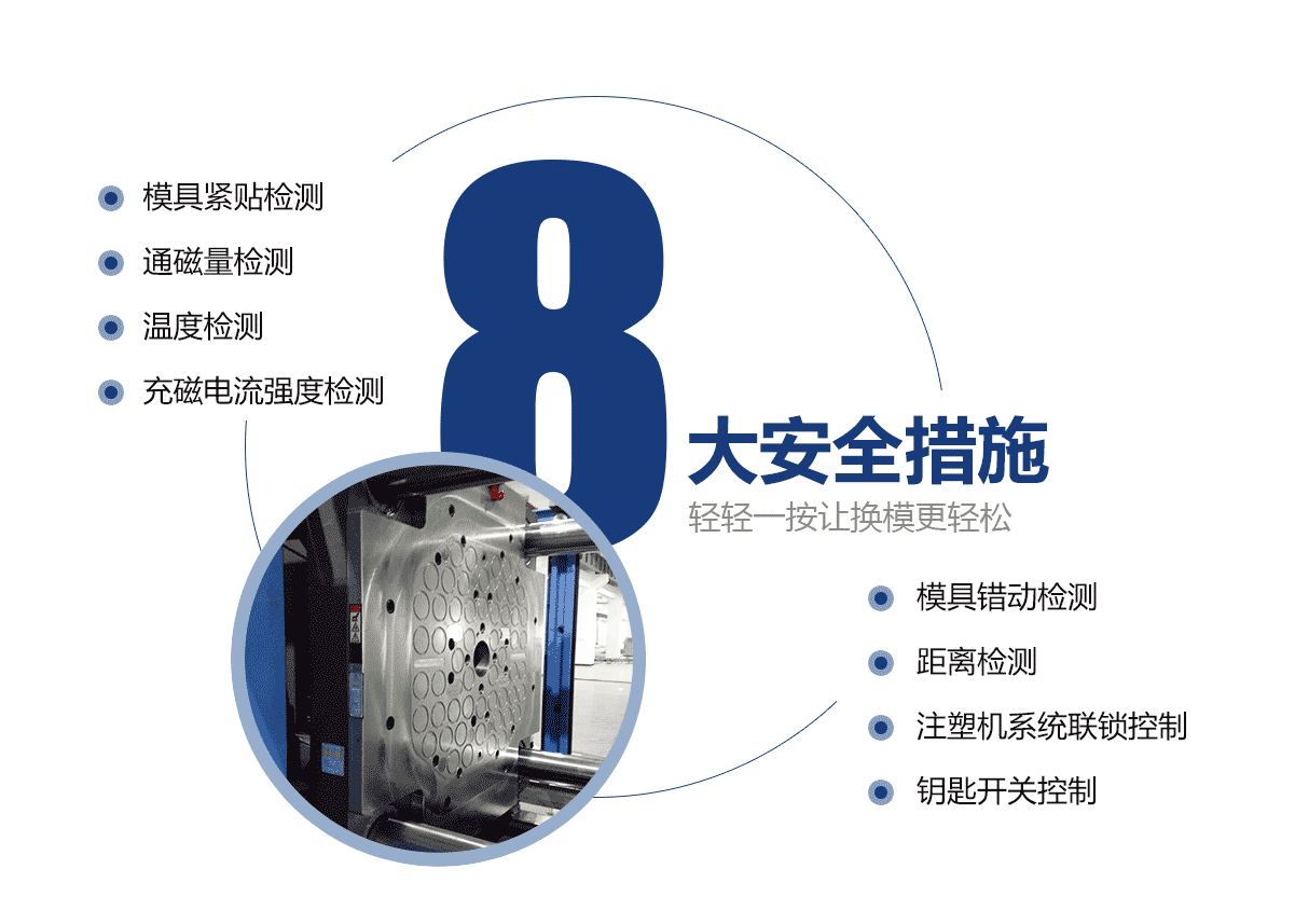 • 電永磁磁力模板適用于各種品牌的注塑機,全新的圓形磁結構,特殊的內部磁路設計,較傳統(tǒng)的磁力模板增加20%。